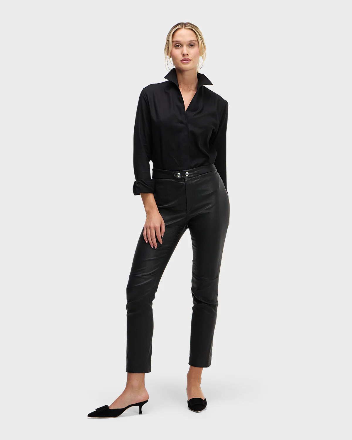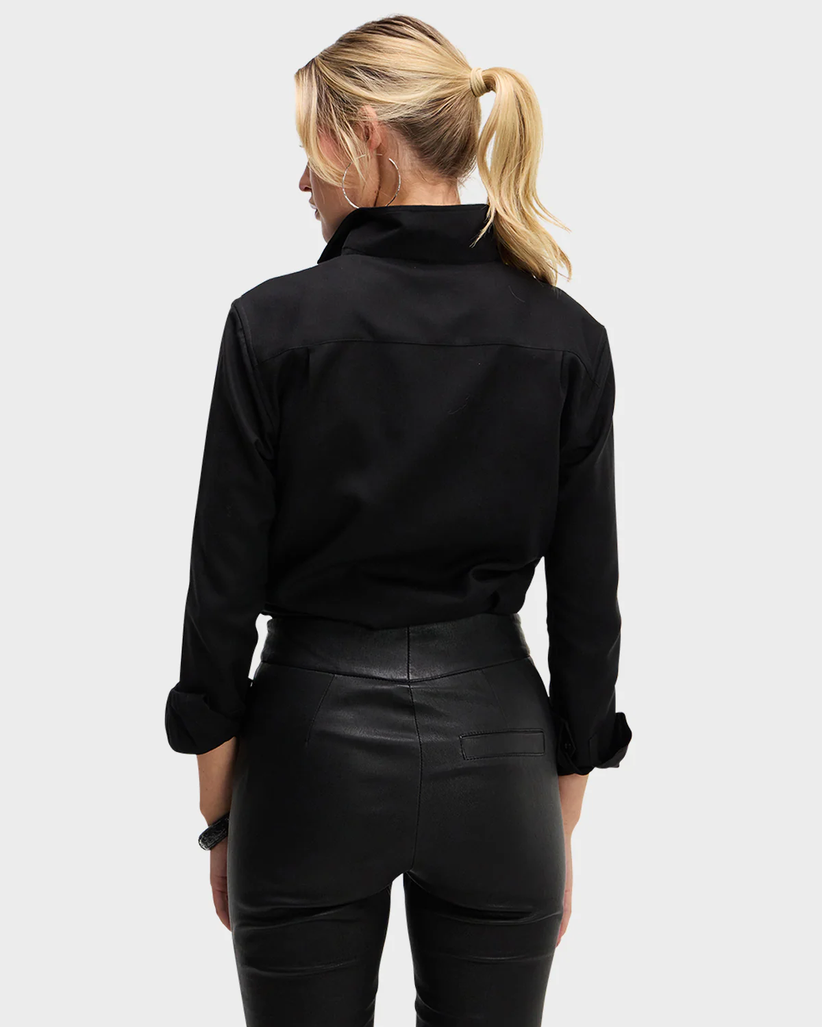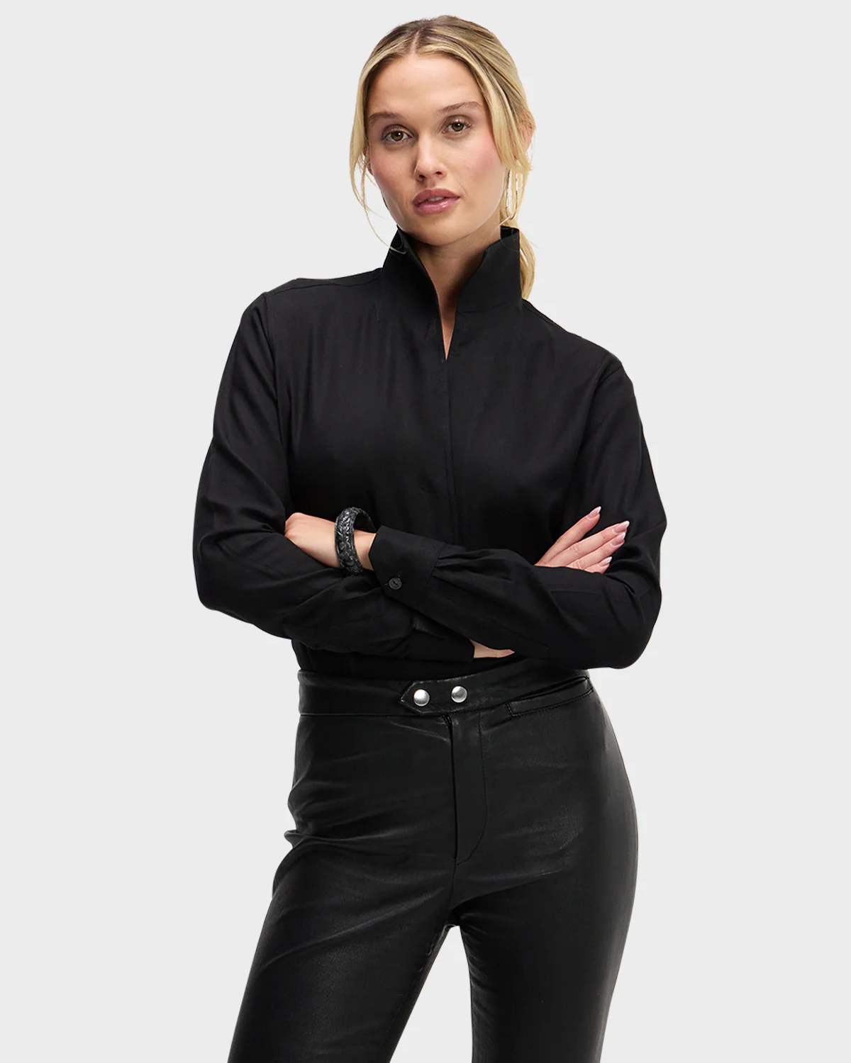 The Signature Shirt is fashioned with Sarah Alexandra's innovative and fully shapeable one-piece collar for dramatic styling. Pop it high, create an alluring angle, or lay it flat—just follow your mood. The concealed front placket hides ingenious fish-eye buttons for a seamless appearance. Chamfer cuffs add extra elegance.